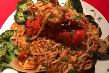 Lobster tail, shrimp, bay scallops, mussels and clams sautéed in tomato sauce, mixed vegetables with linguini.