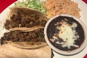 Marinated grilled steak, sautéed with onions, cilantro and rolled into three soft corn tortillas, served with rice, beans and salad. $27.00