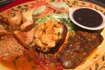 Tender grilled shell steak, lobster tail and shrimp, sautéed with garlic, herbs, olive oil and red sauce, served with rice, black beans and salad. $36.00