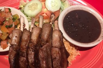 Grilled lamb cooked to perfection, served with black beans, rice, pico de Gallo and salad. $27.00