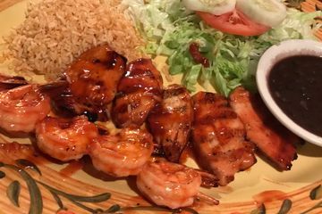 A delicious pairing of skewers of plump barbecue shrimp and tender roasted barbecued chicken, served with salad and rice. $25.00