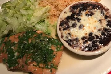 Steak of salmon seasoned with garlic, wine and butter sauce served as Acapulco style with rice, beans and salad. $25.00